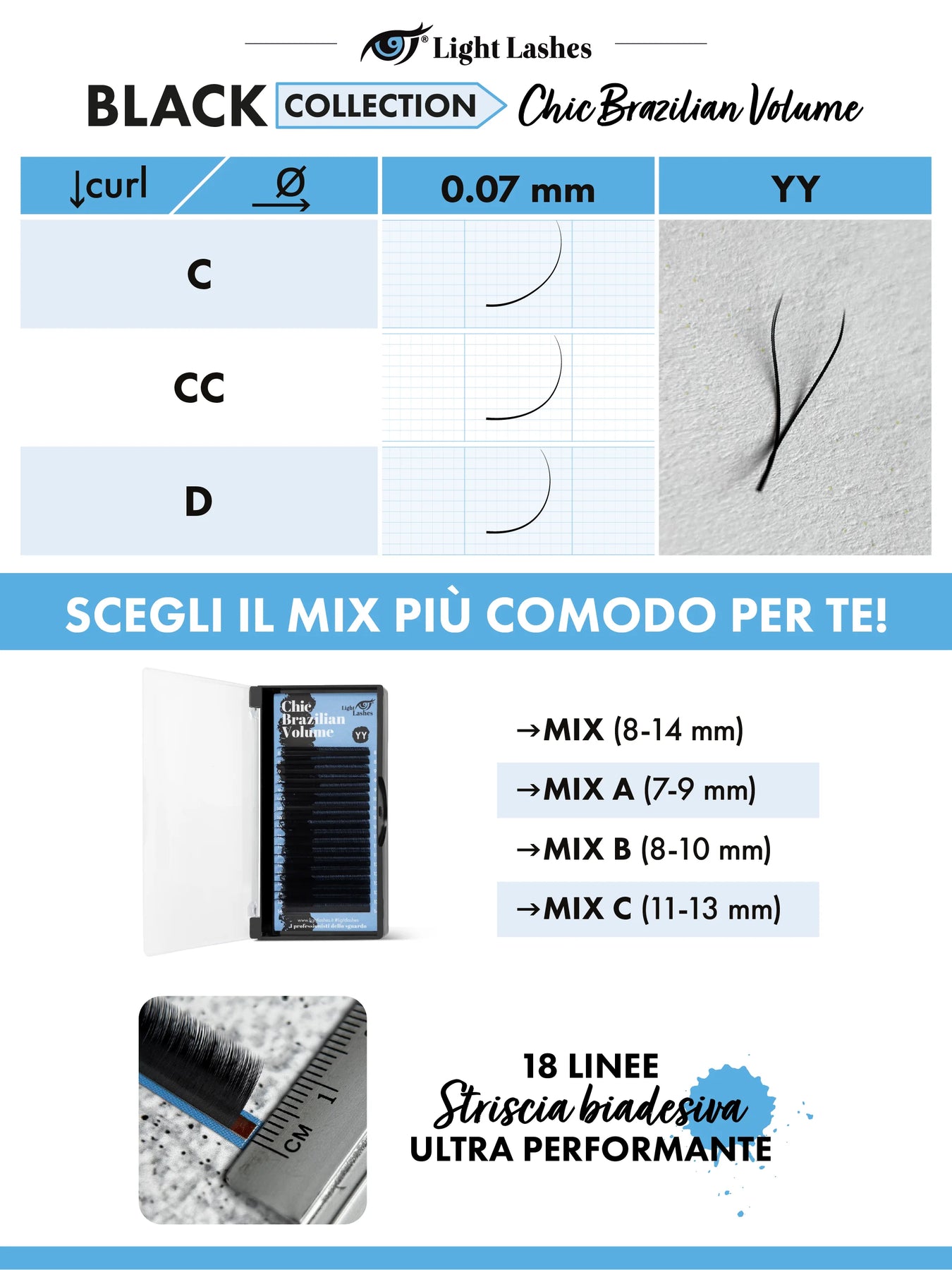 La linea Black Collection Chic Brazilian Volume propone ventagli pronti, creati con la particolare forma a Y che dona un effetto “disordinato e selvaggio” per un look da urlo!I ventagli già pronti accelerano notevolmente il lavoro, che si svolge nella tempistica di un’applicazione di extension Una ad Una ma con un effetto moltiplicato.