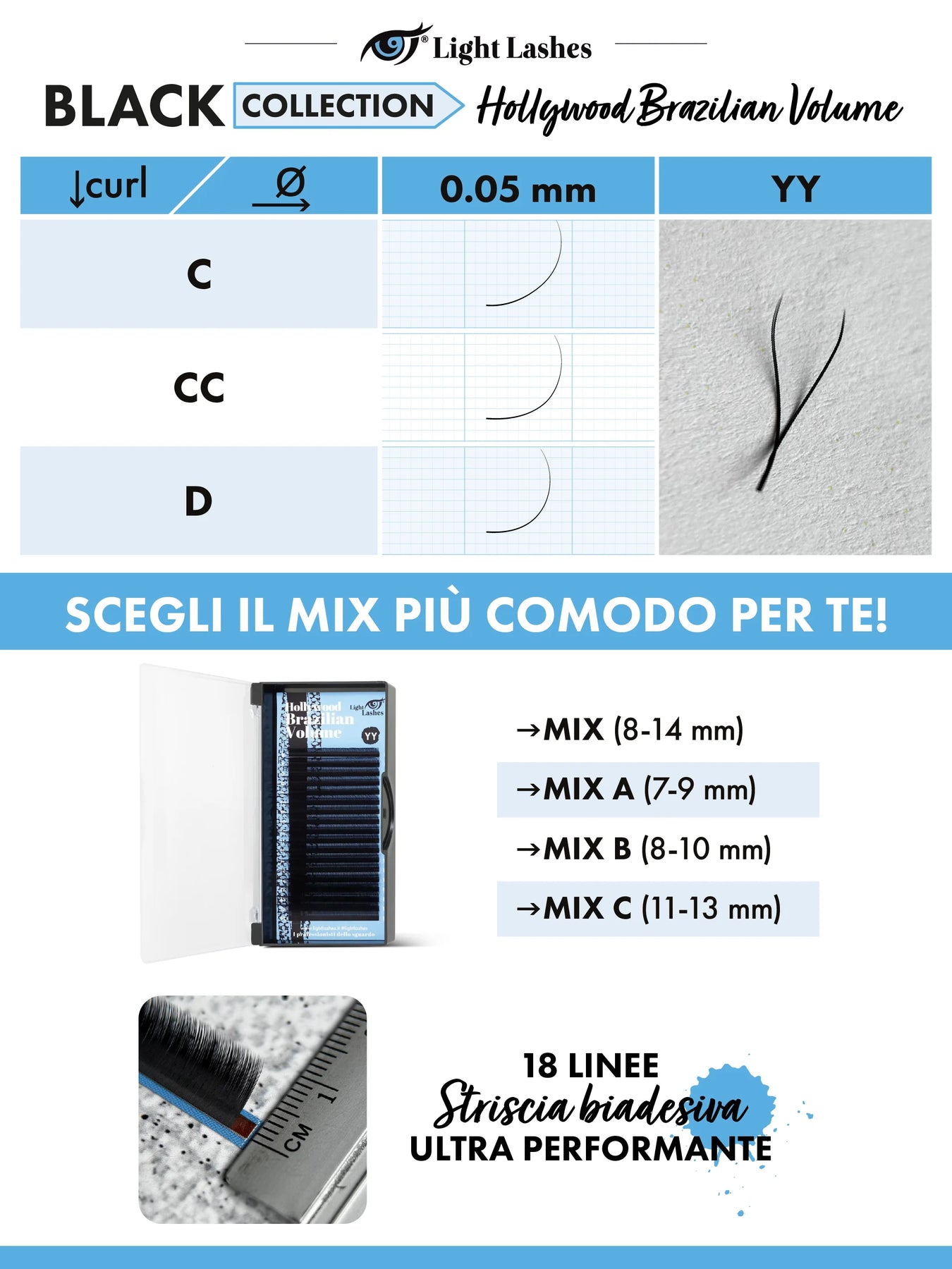 Light Lashes ® Black Collection brings you Hollywood Brazilian Volume eyelash extensions, ideal for creating even fuller volumes with ease ! Perfect for a hypnotic and intense look , which captures attention with elegance and charm. An innovative choice for lashmakers who love to experiment and always stay on the cutting edge.